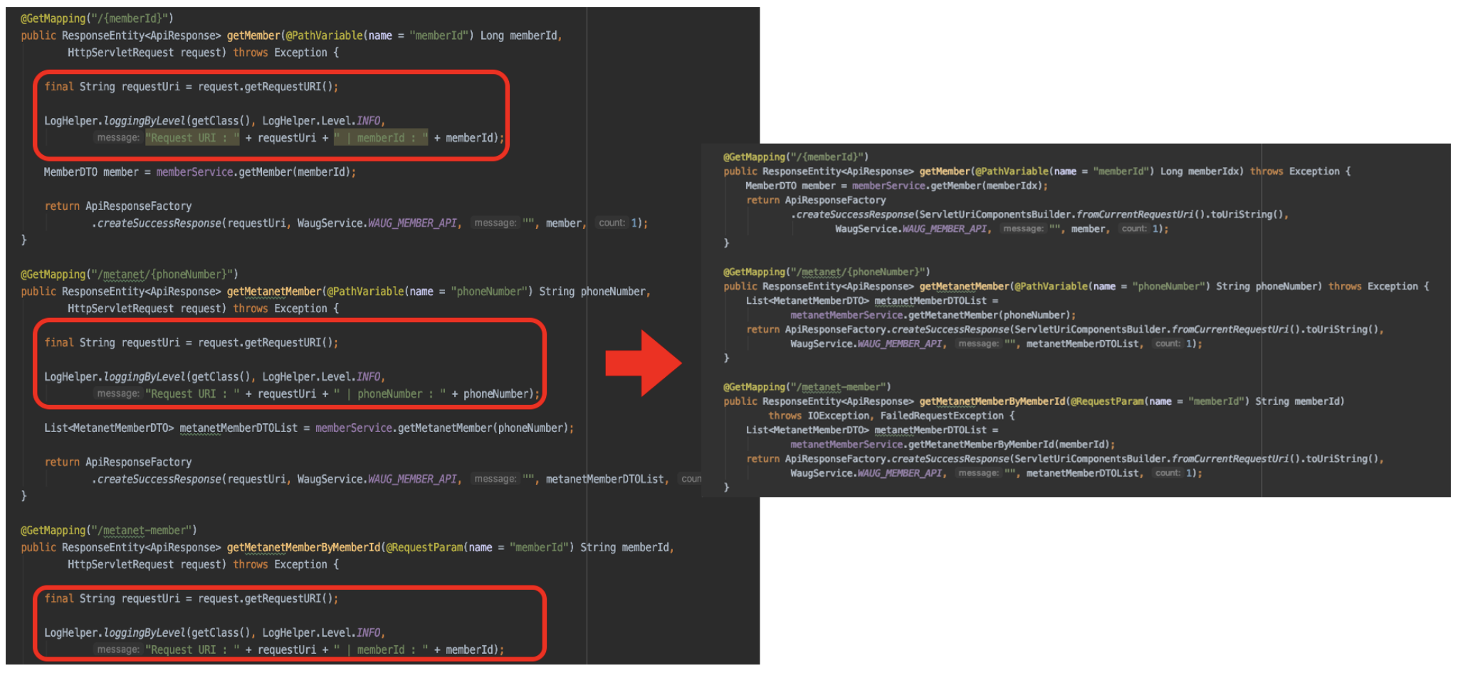 Spring Controller Logging - Spring에서 http request 로깅하기 @GetMapping("/{code}") public ResponseEntity example( @PathVariable(name = "code") String code { final String requestUri = request.ge..